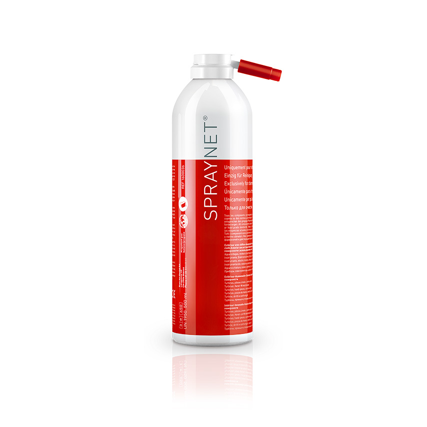 Detergente per manipoli diritti e contrangoli – bomboletta da 500 ml. Cod. 1600036–001 Bien–Air Spraynet riduce la carica microbica del 99,99%. Disinfetta ed elimina i batteri e i virus.