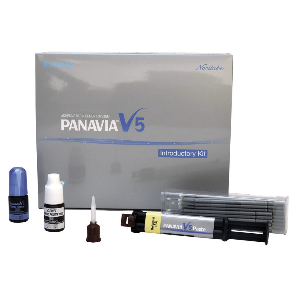 Cemento universale – Introductory Kit (Universal A2): 1 siringa da 2,4 ml. + Tooth Primer 2 ml. + Clearfil primer 2 ml. + accessori 3604 Kuraray Cemento resina a polimerizzazione duale, contiene il primer universale Ceramic Primer Plus che permette di ottenere una superficie adesiva eccellente per tutte le ceramiche integrali, in disilicato di litio, zirconia e allumina, compositi e metalli. Inoltre il primer adesivo Tooth Primer contiene un innovativo iniziatore di polimerizzazione e il monomero 10-MDP in un unico flacone. Indicato per restauri protesici su impianti, cementazione di corone, ponti, inlay, onlay, faccette, ponti adesivi, splint, perni in fibra e fusi su monconi pre-protesici e amalgama. Rilascia fluoro. Kit introduttivo Universale (A2) # 3604 EU – Clear # 3605 EU • PANAVIA™ V5 Tooth Primer (2ml) • CLEARFIL™ CERAMIC PRIMER PLUS (2ml) • PANAVIA™ V5 Paste [una siringa per colore (2.4ml / 4.2 g): Universal (A2), Clear], 10 Mixing tips, • 50 pennellini applicatori fini • 1 vaschetta miscelazione