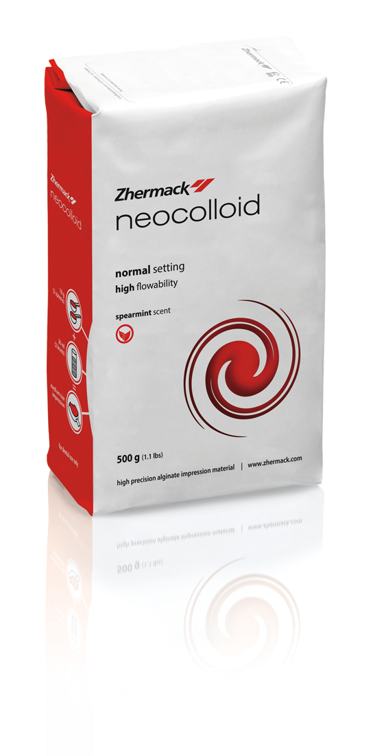 Alginato a presa normale, iniettabile – busta da 500 g. C302205 ZhermackAlginato a presa normale, iniettabile, per impronte di precisione in protesi fissa, non genera polvere. Di colore arancio, aroma clorofilla. Stabilità: 100 ore dall'impronta.