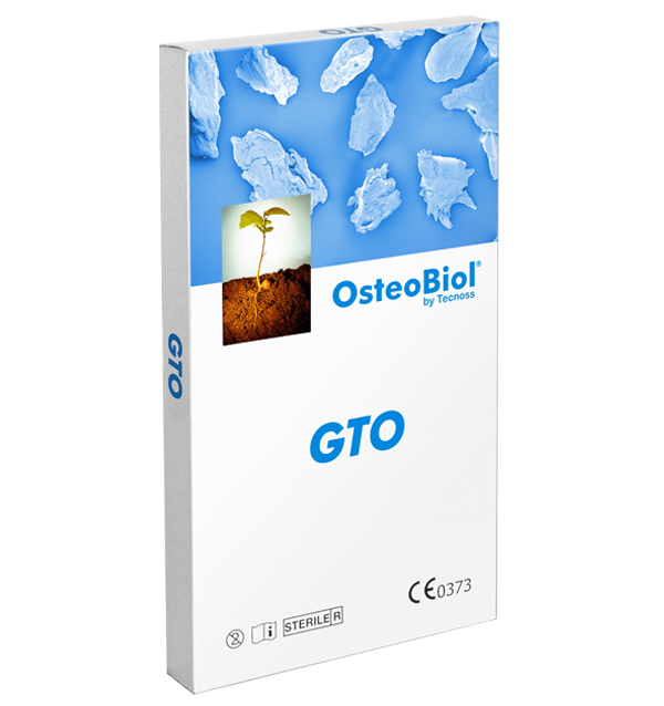 OsteoBiol GTO sostituto osseo di origine suina, mix di granuli collagenati cortico–spongiosi con granulometria 600–1000 .m, siringa da 0,5 cc. codice 2501/05GTO TGT05Confezionamento in siringa sterile da 0.5 cc di granuli cortico–spongiosi collagenati e pre–idratati di origine suina con granulometria 600–1000 micron. OsteoBiol GTO è un sostituto osseo di origine suina. E' un mix di granuli collagenati cortico–spongiosi con granulometria 600–1000 .m, opportunamente miscelati con OsteoBiol TSV Gel, che è a sua volta una miscela di gel collagene eterologo tipo I e III con acidi grassi poli–insaturi diluito in una soluzione acquosa contenente un copolimero sintetico biocompatibile. OsteoBiol GTO viene gradualmente riassorbito ed è estremamente osteoconduttivo. Inoltre il collagene preservato nella matrice facilita il coagulo e la successiva invasione delle cellule rigenerative. Queste caratteristiche esclusive permettono di ottenere una elevata percentuale di osso neo–formato, una ottima preservazione del volume dell'innesto, un tessuto osseo rigenerato sano, e infine una riabilitazione implantare di successo.