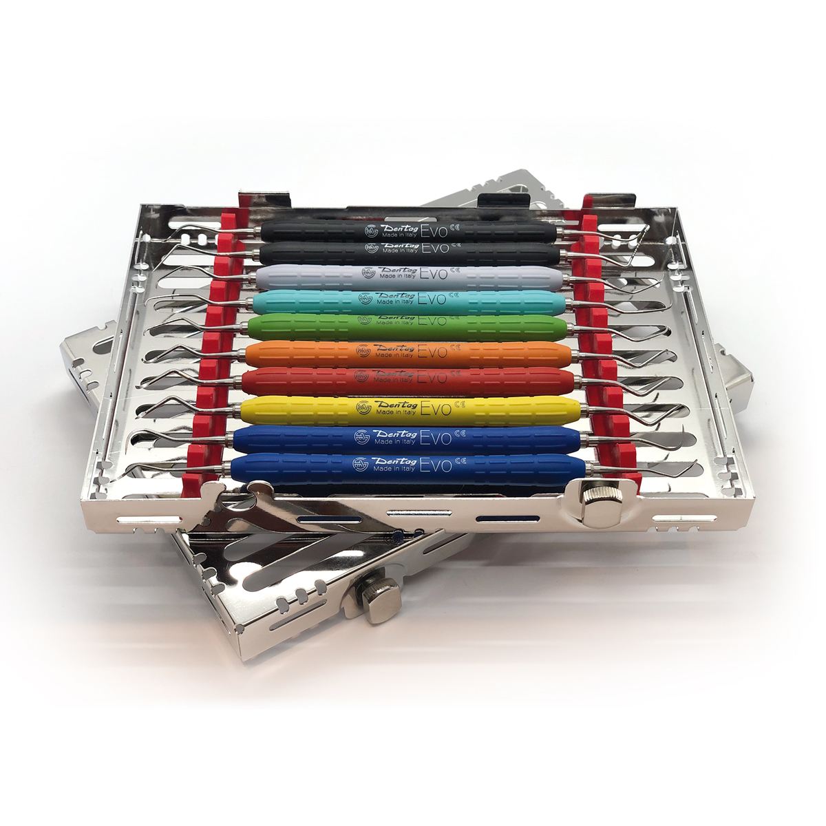 Kit composto da una selezione di sonde, scaler e curette con manico EVO e punte in acciaio per avere a disposizione tutti gli strumenti pił performanti per effettuare una migliore seduta di igiene al proprio paziente Kit composto da. Cassetta portastrumenti da 10 posti Strumento doppio Specillo N.9/Sonda mm CP15 Sonda di Nabers con tacche colorate Curette Gracey Mini-Five 07/08 Curette Gracey Mini-Five 11/12 Curette Gracey Mini-Five 13/14 Scaler H6/H7 Scaler 204SD Curette Goldman-Fox N.4 Scaler M23 Scaler M23A
